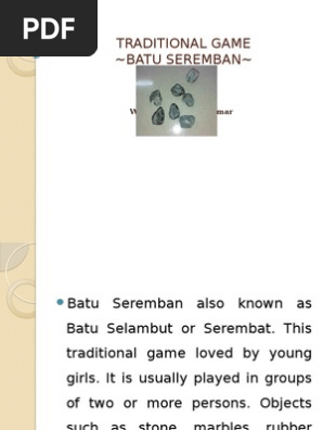 After all, practice makes perfect! These fun play ideas bust boredom! In batu seremban play, there are several stages or different ways of celebrations.starting with a simple first stage by using a fruit called fruit until kepadaperingkat a higher or highest levels of seven named. After that you do seremban, where. Batu seremban, or 5 stones, is a traditional game suited for players of all ages.