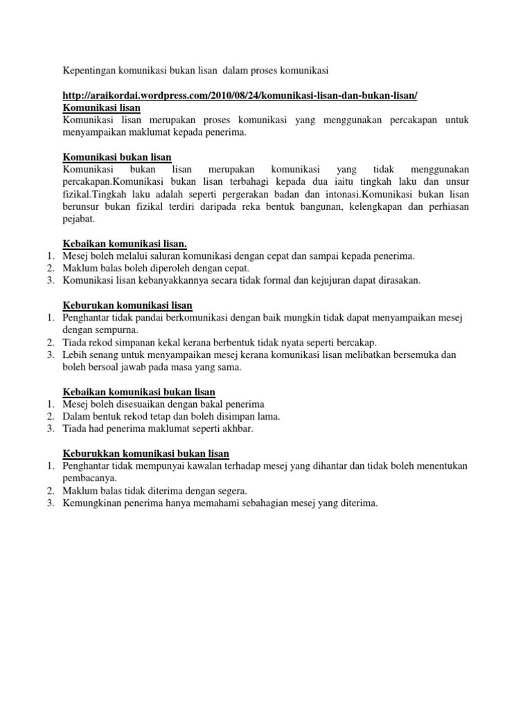 Komunikasi bukan lisan merupakan komunikasi yang tidak menggunakan percakapan.komunikasi bukan lisan terbahagi kepada dua iaitu tingkah laku dan unsur fizikal.tingkah laku adalah seperti pergerakan badan dan intonasi.komunikasi bukan lisan berunsur bukan fizikal terdiri daripada reka. Bahkan pada beberapa kejadian, komunikasi nonverbal dapat menjadi lebih bermakna dan dapat lebih dipercaya dibanding komunikasi verbal 1. Biasanya komunikasi lisan dapat dilakukan pada kondisi para personal atau individu yang berkomunikasi berhadapan langsung. Peserta didik akan mudah mengkomunikasikan berbagai hal yang menyangkut materi pembelajaran, baik secara. Komunikasi lisan secara langusng ialah komunikasi yang dilakukan dengan dua orang atau lebih yang saling bertatap muka dengan langsung serta tidak pada ilustrasi tersebut, si a menjadi pengirim pesan dan si b menjadi penerima pesan.