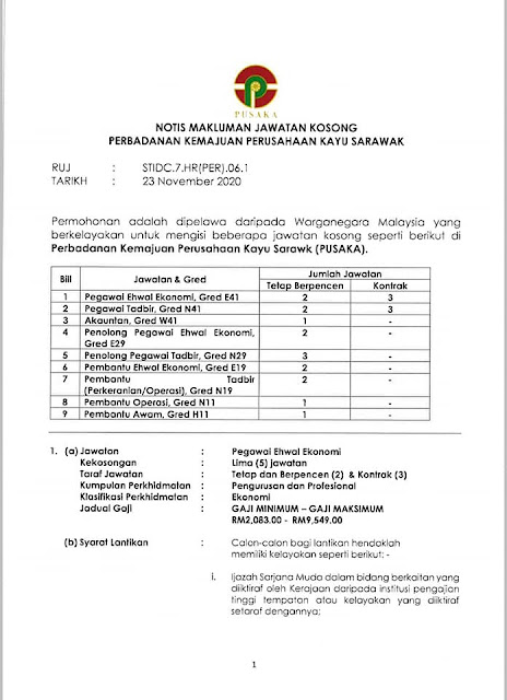 Perbadanan kemajuan perusahaan kayu sarawak (pusaka) ~ pembantu tadbir, pembantu awam, pembantu operasi & pelbagai jawatan.